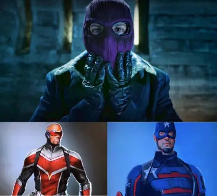 (Ve směru hodinových ručiček) Baron Zemo je Daniel Bruh; Americký agent Wyatt Russel; A Falcon je Anthony Mackie.